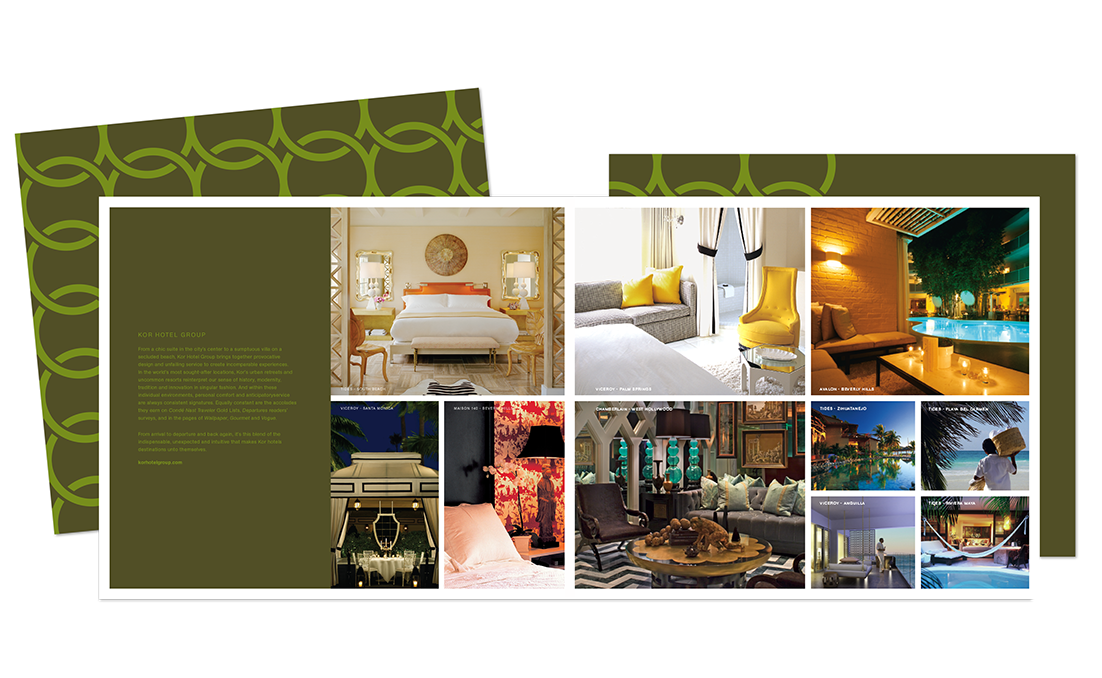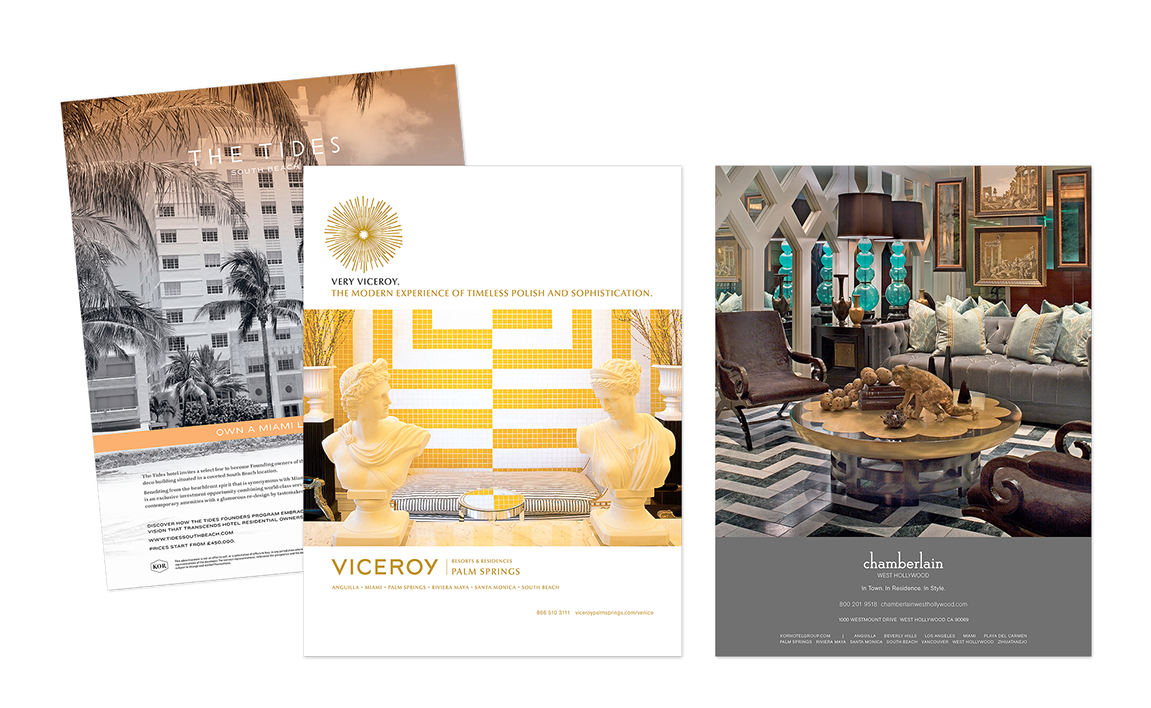 Production for KOR Hotel Group print collateral: examples for The Tides, Viceroy, and Chamberlain.