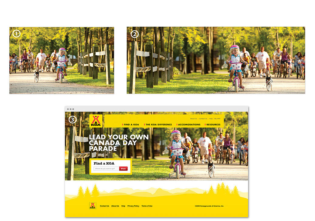 Build-out of homepage image for KOA campgrounds. Number 1 below was the picture I was tasked to start with. Number 2 is the build out and number 3 is the final KOA homepage.